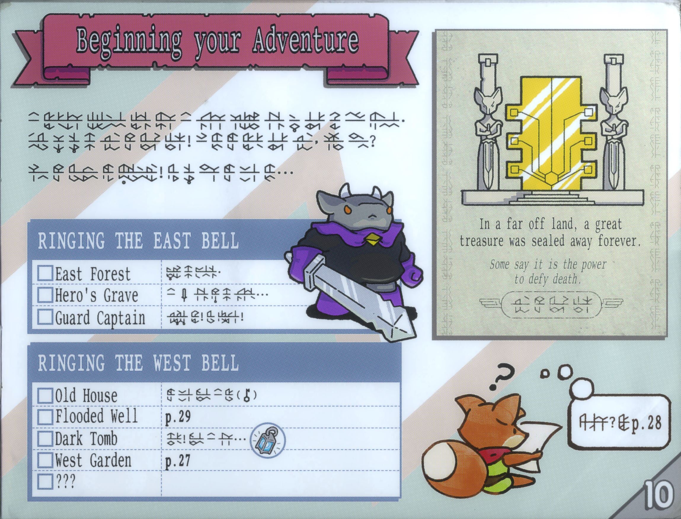The last thing I want to touch on before I wrap everything up is Tunic’s use of its in-game language and the effect it has on the experience as a whole. If every other aspect of Tunic’s ingenious methods of generating an exceptional atmosphere of adventure are the various components of a well-polished orchestra, it’s entirely fictional language is the conductor bringing it all together. Language is often the biggest familiarity we can have with a video game before we end up plowing 10s of hours into it, and removing this comfort blanket brings a fascinating new edge to playing Tunic.