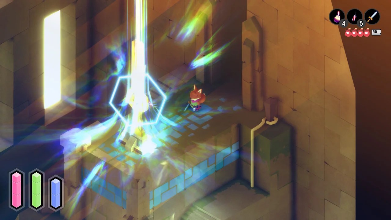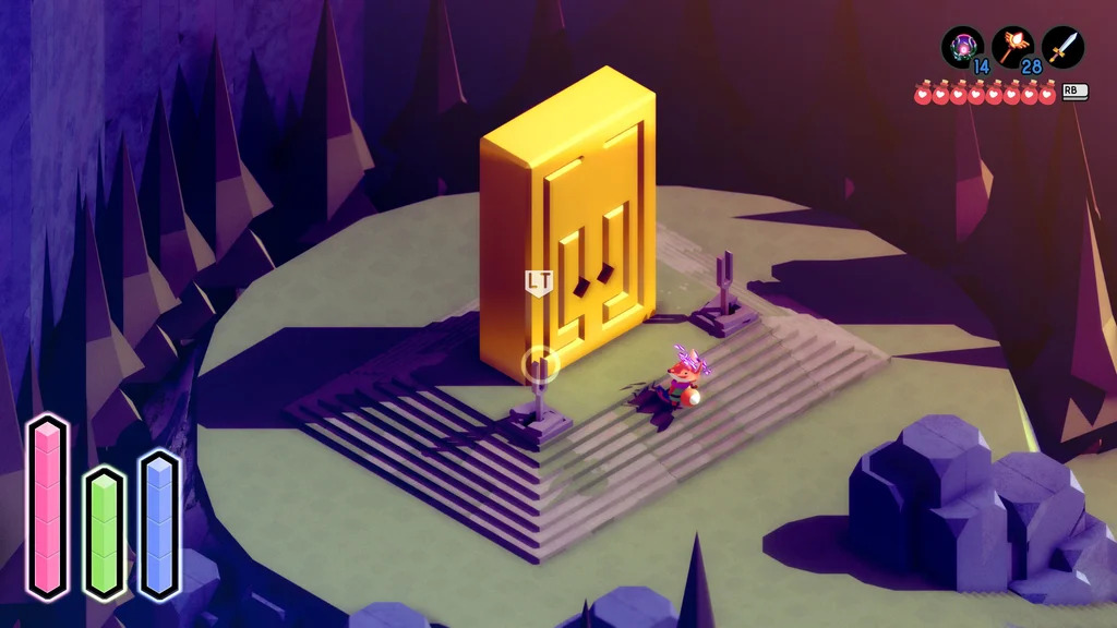 The stamina system is another feature that arguably limits combat options but I actually quite enjoy its implementation in Tunic. Just like magic, stamina is a vital aspect of combat that you’ll need to keep on top of if you want to avoid the sharp end of a Rudeling’s sword. Dodge rolls and shield blocking will both drain your stamina, and if you’re unfortunate enough to run out you’ll take more damage and will also be subjected to a rather adorable hopping animation from Foxy. Just like your health and magic bars, stamina is upgradable, and you’ll need those upgrades when you start encountering some of Tunic’s tricky bosses.